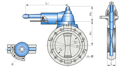 2、本蝶閥系列法蘭孔徑按GB2555-81,1.0MPa標(biāo)準(zhǔn)。